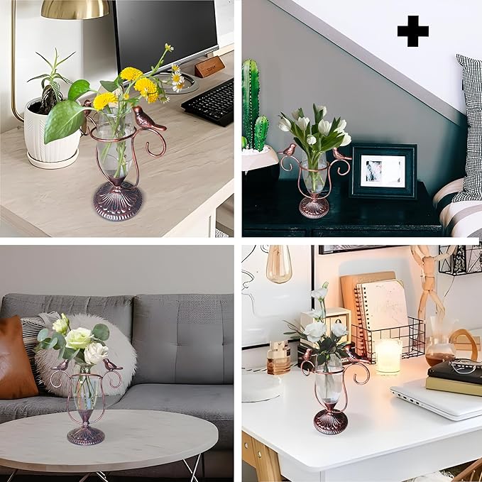 POXOH Vintage Glass Planter - Metal & Glass Propagation Vase with Dual Birds Art, Retro Indoor Planter for Hydroponic Plants, Office Desk Decor, Living Room Centerpiece