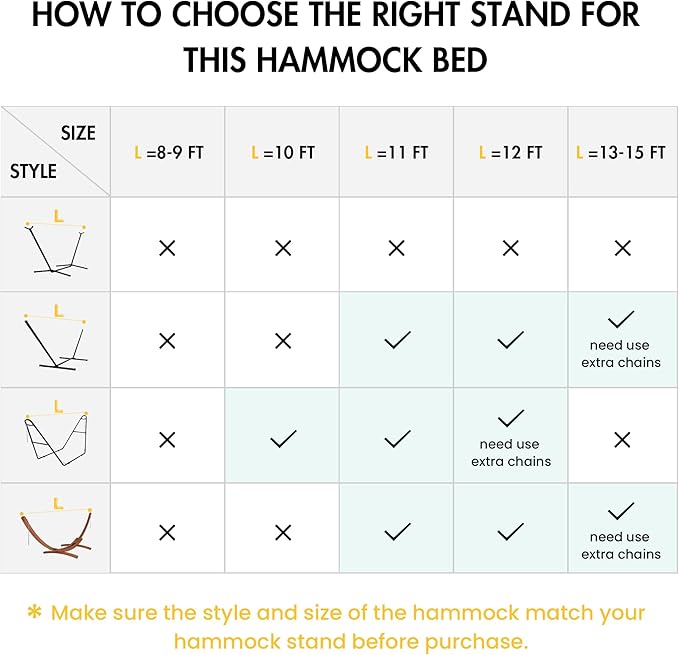 - WIDE USE: Equipped with 14 inches chains, the maximum length of the rope hammock can be up to 149.6 inches, fits 12 FT HAMMOCK STAND. You can also use extra straps to hang the outdoor hammock to the trees, post and anywhere you want. You can read, listen to music and relax in the garden, balcony, patio, backyard, etc