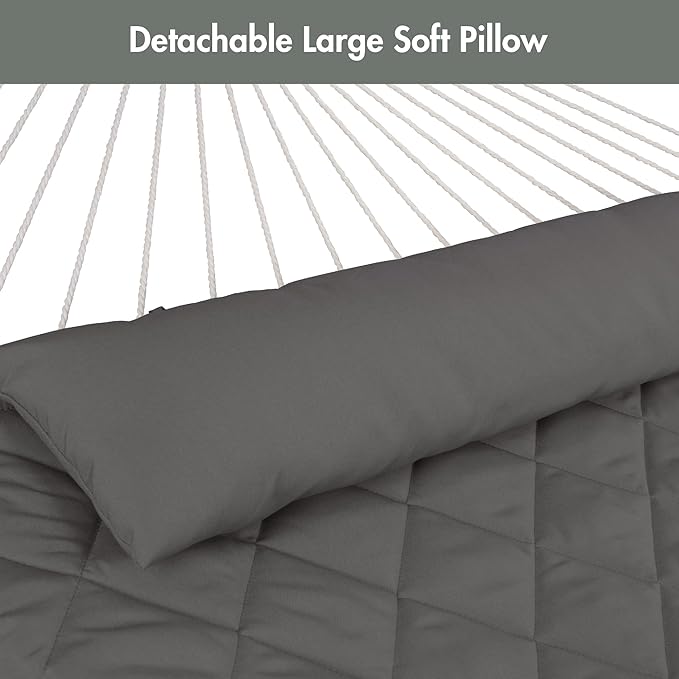 - COMFORTABLE & DURABLE: Double-layered quilted polyester fabric with inner polyester wadding is soft, breathable and long-lasting. Special sewing design increases the beauty and practicality of hammock swing. Extra polyethylene stuffing head pillow offers you superior comfort. Hammock pad is detachable for easy cleaning. It will not fade after long-term use