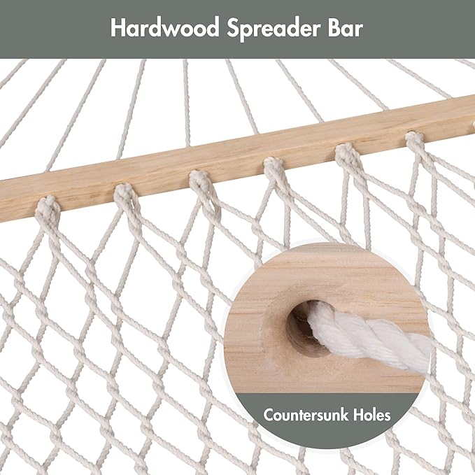 - SPREADER BAR HAMMOCK: 52 inches hardwood spreader bar has countersunk holes, hence reducing the friction between the rope and wood, offering maximum durability and stability. Our hammock significantly outperforms others’ non-countersunk varieties