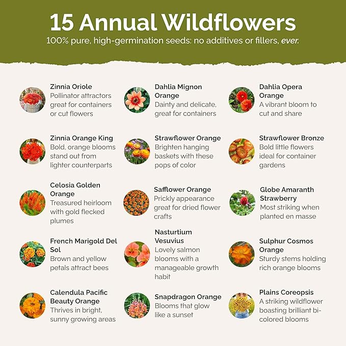 - 100% Pure, Non-GMO Seeds - No fillers, favorites only! Includes 15 easy-to-grow species: Zinnia Oriole, Dahlia Mignon Orange, Dahlia Opera Orange, Zinnia Pompon Orange, Double Strawflower Orange, Double Strawflower Bronze, Celosia Golden Orange, Safflower Orange, Globe Amaranth Strawberry, French Marigold Del Sol, Nasturtium Vesuvius