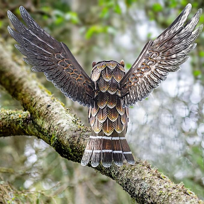 - Vivid garden accent: Garden owl statue is made of textured and layered metal sections. The lines of the bird are smooth and non-rigid, spreading their wings as if they are about to fly away. It will Invigorating your garden.