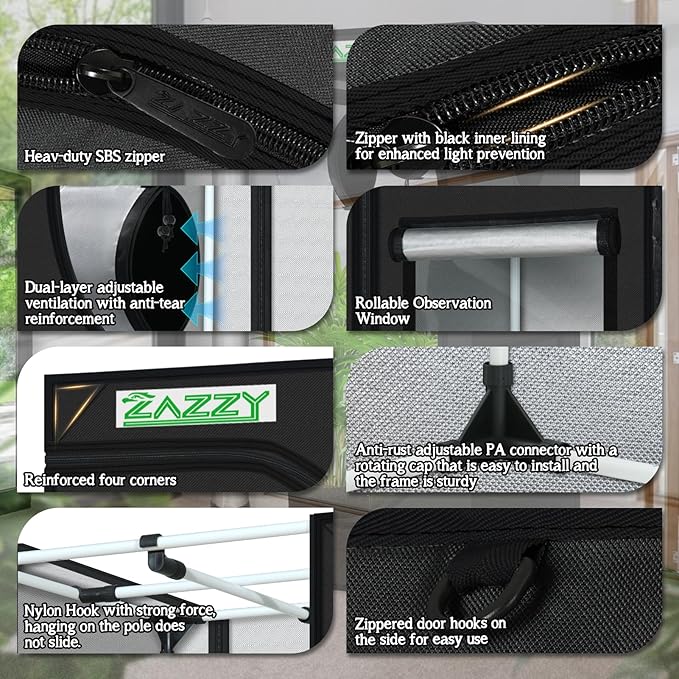 - Top-Quality Materials and Sturdy Frame---Zazzy plant grow tent made of superior quality reflective 600D mylar and double stitched to ensures the light blocking. Heavy duty all steel poles which are rated to handle at least 110 lbs. The frame is specially finished to ensure smooth installation and safe handling.