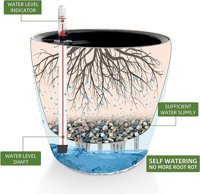 - Self Watering System: The integrated water reservoir keeps soil moist and automatic, with an indicator to show when to water again.