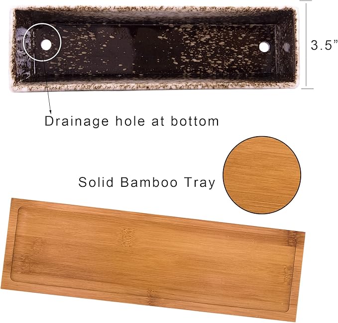 - 【Dimension】The package includes a rectangle succulent planter pot with bamboo tray in perfect size: 12 inch(L)*3.5 inch (W)* 2.7 inch (H). For any quality problems, please feel free to let us know. Artketty will never disappoint any customer.(PLANTS NOT INCLUDED)