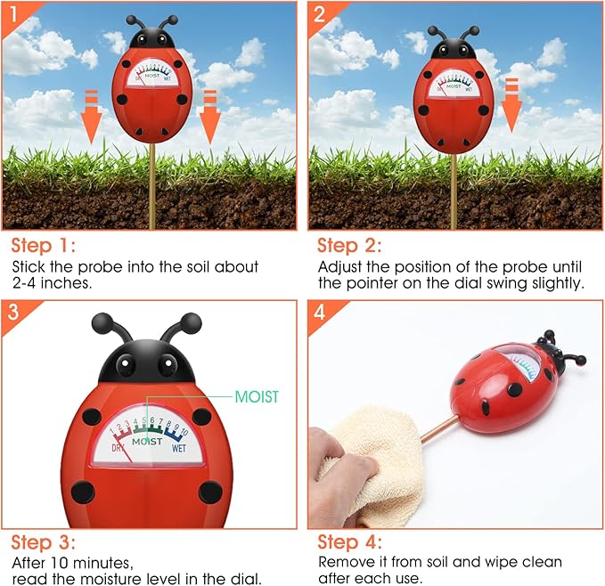 - 【CUTE LADYBUG DESIGN & PERFECT GIFT】Spruce up your garden tools with this fun and functional ladybug-themed moisture meter.Cute ladybug shape, suitable for children's gardening activities, and a perfect and practical gift for friends, kids, gardeners and others.