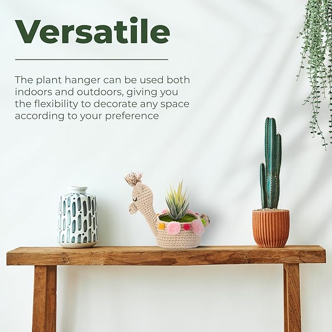 - Unique Crocheted Plant Pot Cover - Elevate your home with our exclusive crochet plant hangers! Our outdoor and indoor hanging planters add charm to your small plant pots. This llama-designed desk and wall hanging planter is a playful way to display your favorite plants and succulent pots.