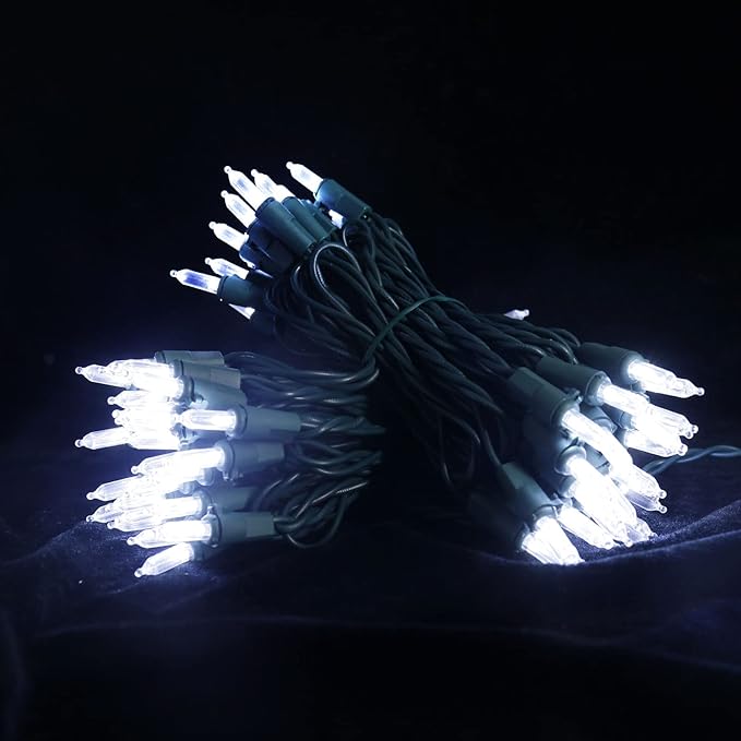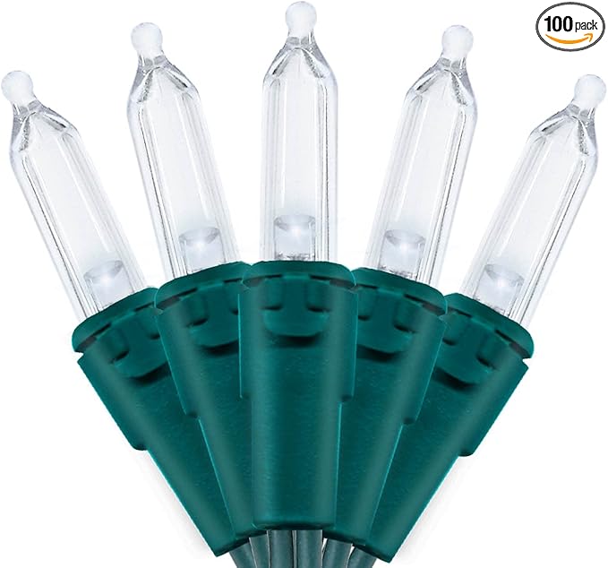 - 【Mini LED Christmas Lights Specification】: This green wire christmas string lights includes 100 count cool white led lights, total length 35.3ft, lights length 33ft and each led is 4 inches apart, 24 inches lead wire, 4 inches end connector (Extra 2 x replacement bulbs and 2 x fuse included)