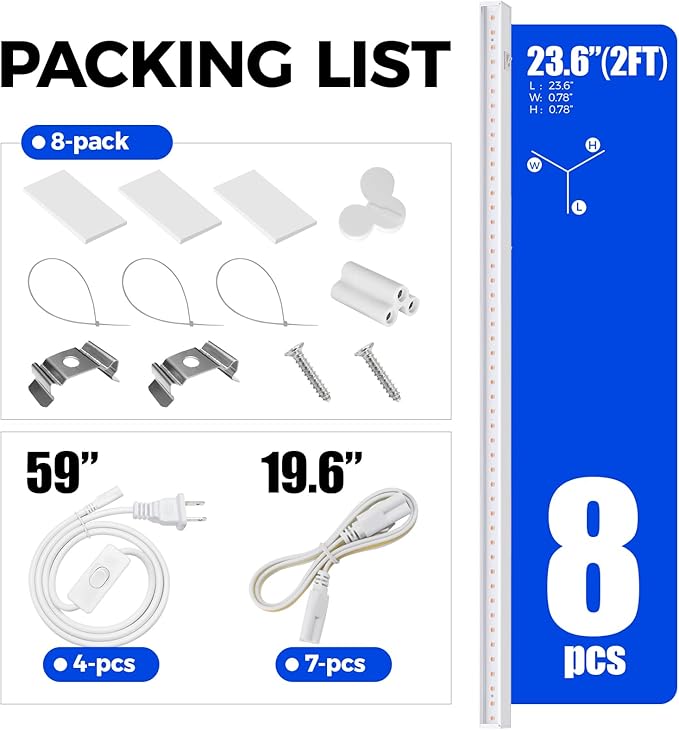 - What You Get: 8 x Barrina T5 Grow lights, 4 x Power Cords with ON/OFF Switch, 7 x Connecting Cords, 8 x Small Connectors, 16 x Installation Clips, 24 x Double-sided Tapes, 24 x cable ties.