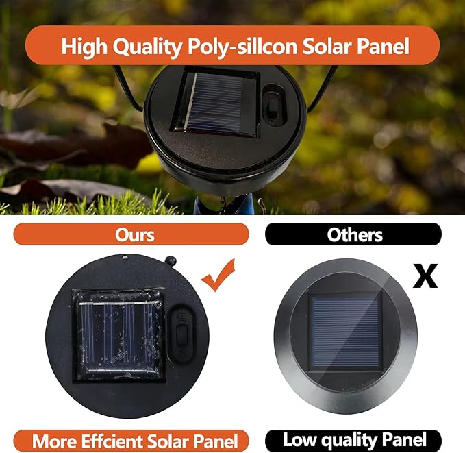 - 【Upgraded Solar Panel】- The external solar panel can more fully absorb the sun to ensure that the battery has enough energy storage. The improvement in design can solve the problem of too few lighting time at night. During the day, you have to place the product in a well-lit place for more than 8 hours and turn on the switch, and it will automatically light when night falls