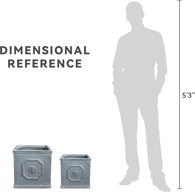 Kante Square Lion Head Concrete Planter Set of 2, Classic English Style Plant Pot with Drainage Hole and Rubber Plug for Indoor Outdoor, 10.2"x10.2"x10.2" and 12.6"x12.6"x12.6" Antique Gray
