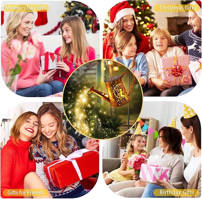 - Solar lights With Wide Application: Our solar watering can with lights(with Warm White Installed Light String) is good for DIY: watering plants, tree vines, potted, decorations, wedding, party ,dinner table, porch, bedroom, window, balcony, wall, Christmas,Thanksgiving, birthday , anywhere indoor or outdoor decor (Product includes shepherd's hook)