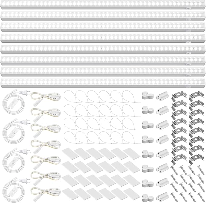 - What You Get: 8 x Barrina T5 Grow lights, 4 x Power Cords with ON/OFF Switch, 7 x Connecting Cords, 8 x Small Connectors, 16 x Installation Clips, 24 x Double-sided Tapes, 24 x cable ties