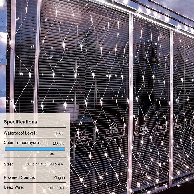 - Fully Waterproof: Net string lights is IP68 fully waterproof, which can be used normally even in bad weather outdoors. (note: the adapter is not waterproof, it needs waterproof treatment for outdoor use)
