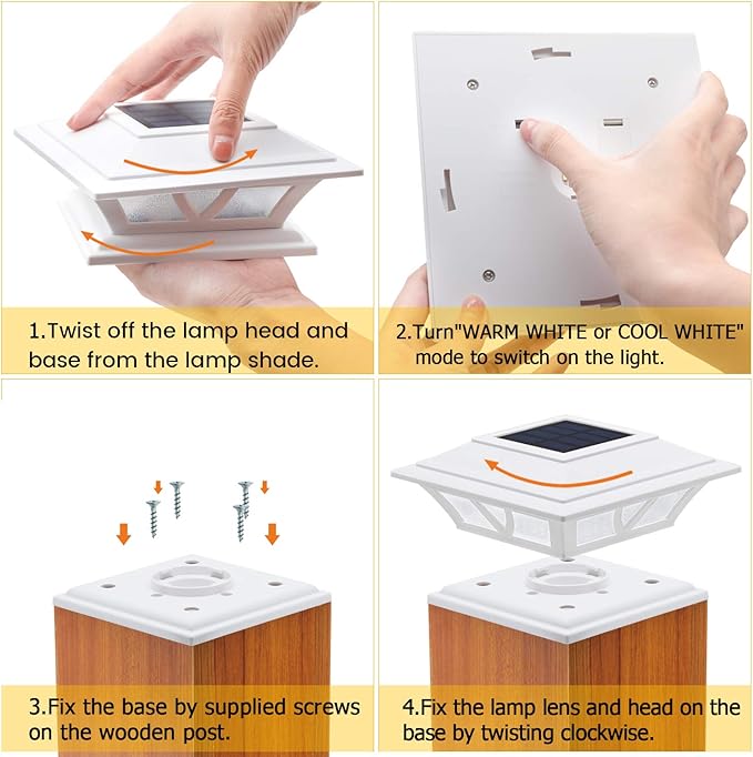 - 【Easy to Use】Install them according to the instructions, fix the base by supplied screws on the wooden post. Solar powered post lights are charged in the daytime for 6-8 hours under the sun, and will turn on for 10-12 hours in the nighttime automatically.
