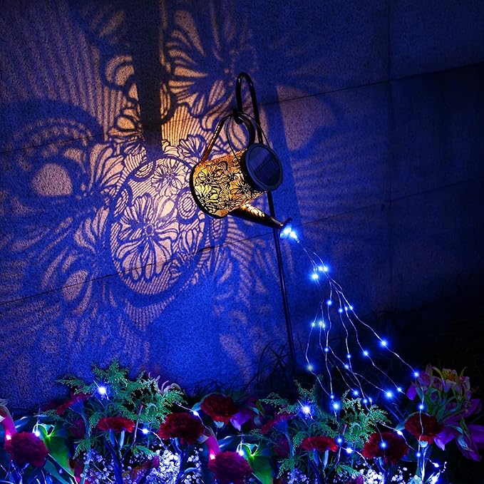 - Solar Watering Can With Lights -- VOOKRY Solar Garden Lights(with Shepherd Hook) comes with 5 LED String Lights (50 LEDs), The light wire is 3.28 feet long, which can be easily bent and shaped into any shape you like, perfect for DIY. Turn on the light at night and it will present a vivid and beautiful retro hollow pattern. Decorate your watering plants, vines, potted plants, porches, paths, patios and more, the perfect addition to your garden decor