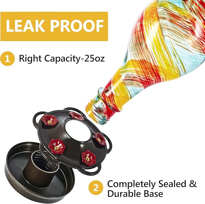 - LEAK PROOF: This vintage glass hummingbird feeder features a convenient 25 fluid ounces capacity, a slender shape and a completely sealed base that has the least leaking, drips and spills.