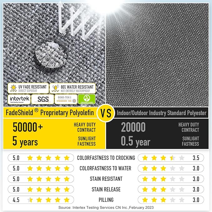 - 【FadeShield - UV Fade Resistant】FadeShield Proprietary Polyolefin are dependable indoor/outdoor performance fabrics, they are infused with antimiсrоbial silver Ion technology and can withstand 5 years of UV fade resistance, solution-dyed to make sure that each color is deeply ingrained in every fiber for continued vibrancy, even after heavy use. We recommend bringing it indoors when it rains or when not in use to preserve its lifespan and keep it looking beautiful.