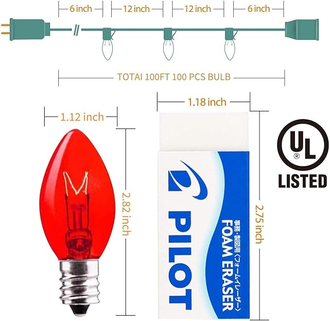- Christmas string light, 100pc C7 multicolor bulbs, 6" lead with male plug, 12" spacing between bulbs, 6" tail with female connector. Lighted Length 99 Feet, total Length 100 Feet. Not connectable