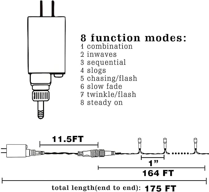 - 8 Lighting Modes: There are 8 lighting modes can be chosen: combination, in waves, sequential, slo-glo, chasing/flash, slow fade, twinkle/flash, steady on. You can choose different modes according to your mood and the atmosphere you want to create.