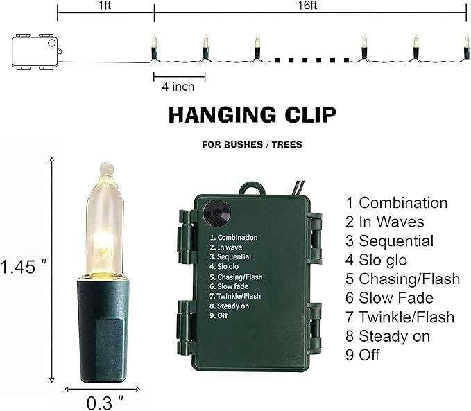 - 8 Lighting Modes: Dazzle Bright mini string lights has 8 different lighting methods, including combination, in wave, sequential, slo glo, chasing/flash, slow fade, twinkle/flash, steady on. Press the button on the battery box to select the lighting mode you like.