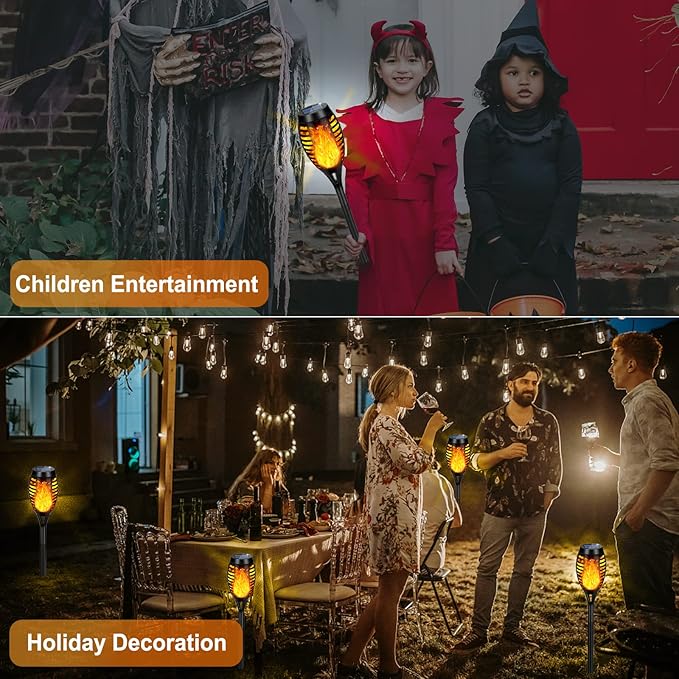 - đăOCCASIONS WIDELY USEDăThe beating flame of the garden lights solar powered waterproof illuminates your house, garden, patio, yard, passage, driveway, etc. in the dark, so that the whole home is still bright and warm in the dark night; solar flame torch lights outdoor can be added to parties, camping, barbecues, weddings, etc. Bonfire atmosphere; can be used as a festive landscape decoration to provide the perfect romantic holiday atmosphere for your Halloween, Christmas, Valentine's Day, etc.