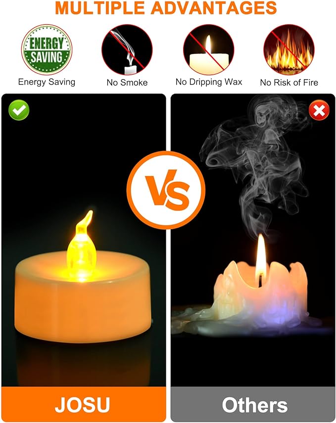 - Flickering Create A Realistic-Looking Flame: JOSU flameless candles mimic the appearance and the flame-burning wicks of real tea candle, the warm yellow flameless LED tea lights candles flicker and provide the effect of an actual candle, which will impart their delightful warm glow to any room. Everyone will impressed with how realistic those fake led candles look when they flicker.