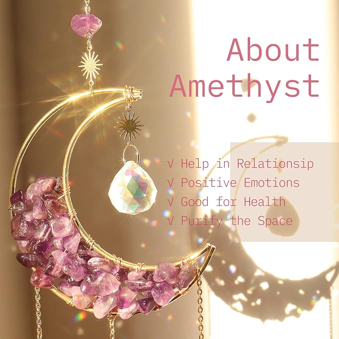 Amethyst Crystals Suncatcher - Hanging Moon Sun Catcher with Glass Prisms for Windows, Healing Amethyst Crystal Decor for Home, Gift for Christmas Birthday Valentine Mothers Day