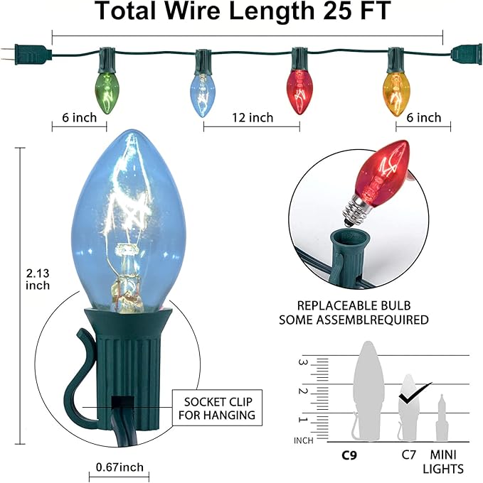 - [Old School Christmas Lights] C7 clear colorful bulbs with candelabra 5W/(E12) socket base. warm white Christmas light bulbs. Removable bulbs provide flexibility for easy replacement and customizable designs. If one light goes out, the rest stay lit. UL Listed for Outdoor use.