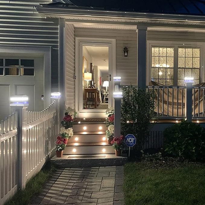 - Beauty and Unique design: Modern solar deck post lights feature with 4 unique blue lights around, and built-in 52pcs LED SMD provide with high lumen 6000K white lighting, adding radiance and distinction to gardens, yards, walkway, decks or fence post solar lights creating a well-lit path to your outside environment.