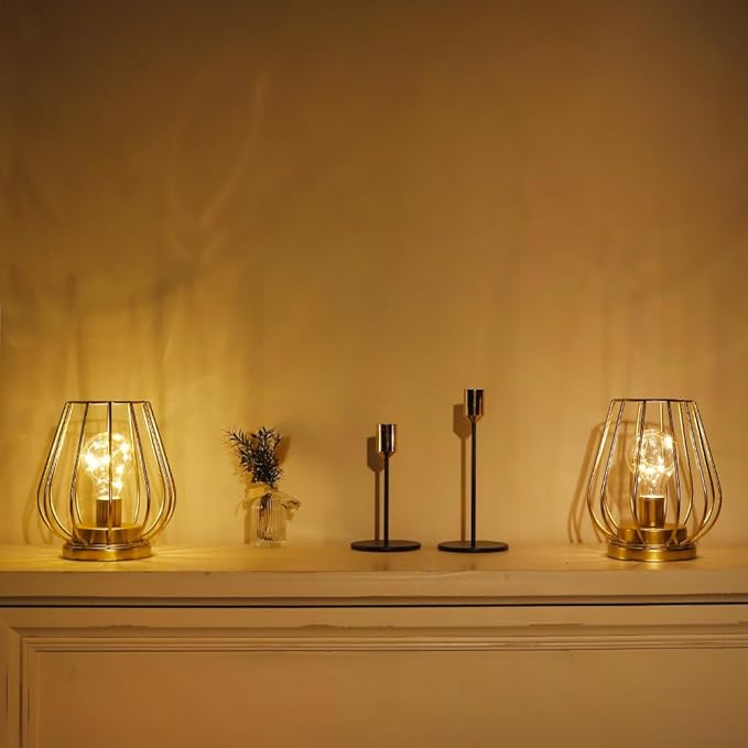 TRIROCKS Set of 2 Metal Battery Operated Lamp 7'' Tall Cage Shape Cordless Table Lamp Battery Lanterns with Warm Fairy Lights Bulb for Patio Garden Wedding Parties Indoor Outdoor(Gold)