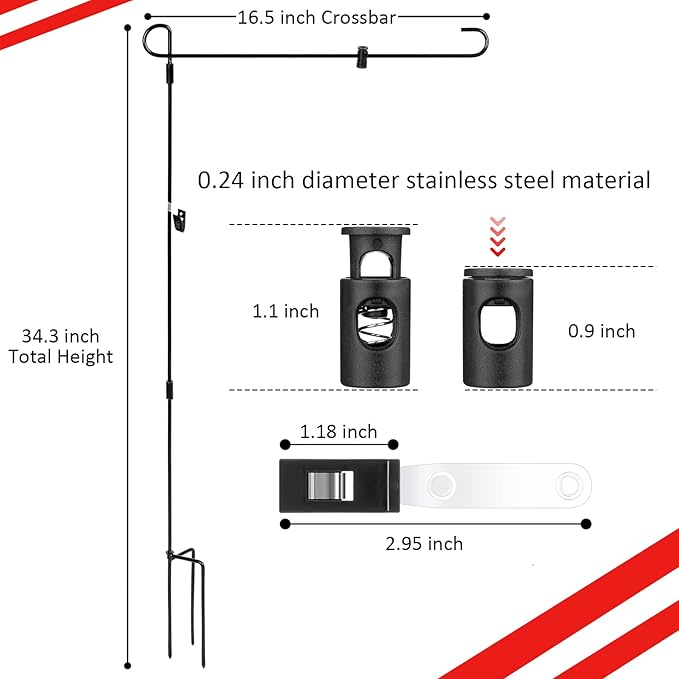 - Attractive Design: our outdoor garden flag holders bulk measure 34.3 inch tall and 15 inch wide, which is a suitable size to hold up any flag within 15 inch width; The tiger clip could make sure your flag is fixed in the storm, and effectively fix flags from being blown away; These stoppers could be adjusted in size and adapted to different sizes of flag poles