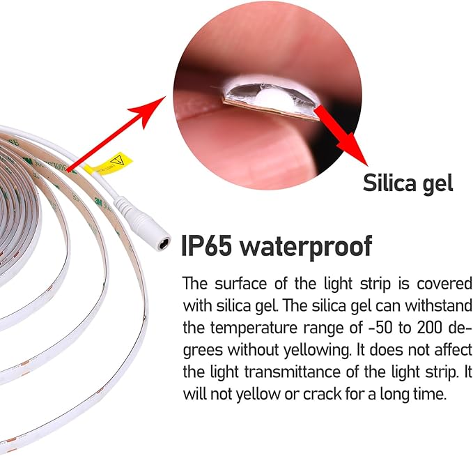 - 【COB LED Strip】480LEDs/M, 2400LEDs/5M, COB light strips have more dense LED chips, Which make the emitting units nprecedentedly close to each other, and create super even lighting performance. At the same time, it brings higher luminous efficiency.
