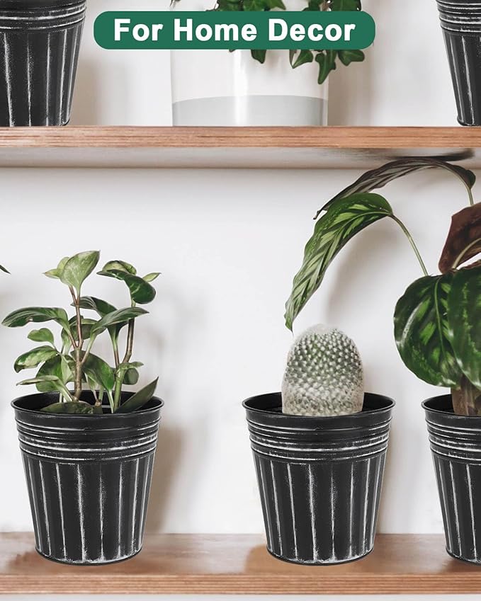 vensovo 6 Inch Black Metal Rustic Flower Pots - 6Pcs Galvanized Planters with Drainage Hole and Rubber Plug, Rustproof Metal Bucket Plant Pots Farmhouse Vintage Style for Decor