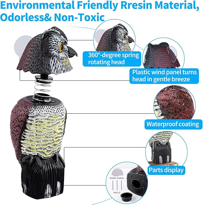 - 🦉【360°Rotating Head】: Our plastic owls to scare birds away has a 360°rotatable head. Very realistic smooth head movement at any slight breeze, which can vividly scare away birds, owls and other animals. A wind panel on the rear of head can double as a wind vane!(There is a small bag in the bag, with nails and plastic transparent wind board) Suggestions: simulate life scenes, move and rotate the owl decoy after a period of time, and have more effects better.
