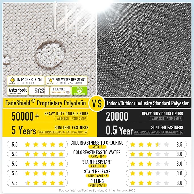 - 【FadeShield - UV Fade Resistant】FadeShield Proprietary Polyolefin are dependable indoor/outdoor performance fabrics, they are infused with antimiсrоbial silver Ion technology and can withstand 5 years of UV fade resistance, solution-dyed to make sure that each color is deeply ingrained in every fiber for continued vibrancy, even after heavy use. We recommend bringing it indoors when it rains or when not in use to preserve its lifespan and keep it looking beautiful.