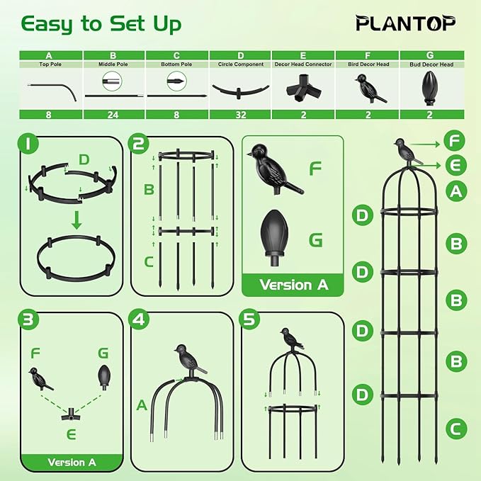 - 🍒【Easy to Put Together with Mark】This Trellis for Climbing Plant is easy to install by one person without tools. The most important advantage - Exclusive letter stickers. You can effectively identify each component, referring to Figure 5 and the video for quick installation. With a detachable design, the plant cage trellis is easy to take apart and only occupies a little space. For environmentally friendly, you can also store these garden tower trellis for next year's use.
