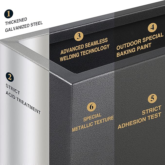 - 【No Assemble and Seamless】Our flower box arrives fully assembled and requires no additional setup. Simply unpack and place it in your desired location for instant use, saving you time and effort. Crafted using advanced fully automatic welding technology, this flower box features a seamless, one-piece design with a smooth and even surface, ensuring long-lasting durability and a polished appearance.