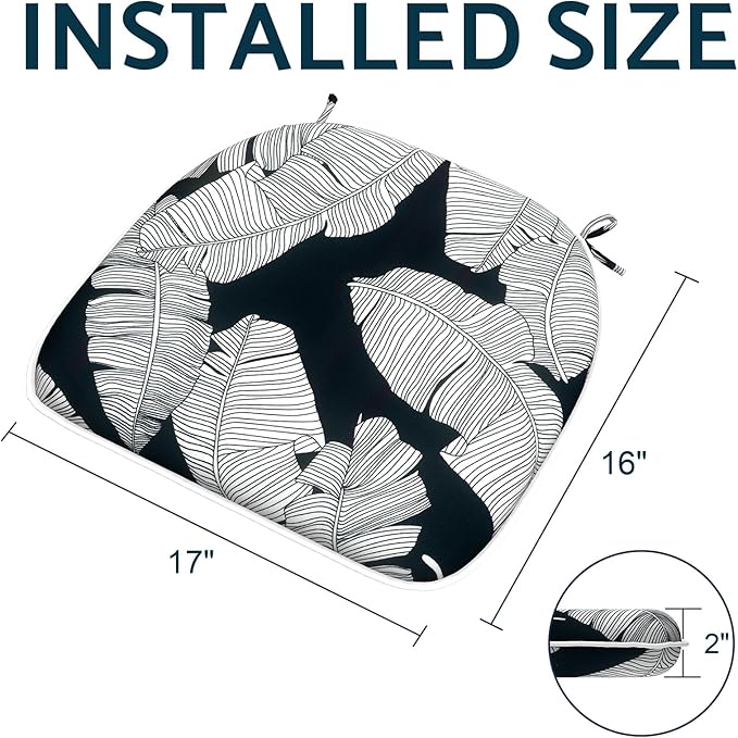 Indoor/Outdoor Chair Cushions 16x17 Inch, Patio Chair Cushions with Ties, All Weather Seat Cushions for Patio Furniture Home Garden Chair Use, Set of 4, Black Lush Leaves