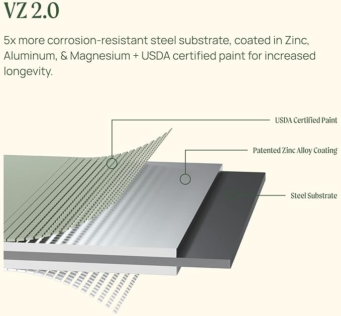 - Better Material: We have combined a Zinc, Magnesium, and Aluminum coated steel with our award-winning and USDA approved AkzoNobel paint to develop a new material which we call VZ 2.0. The first material of its kind is 100% safe, eco friendly, with a long 20+ year life. VZ 2.0’s exceptional performance has been verified at the Texas A&M National Corrosion & Materials Reliability Lab