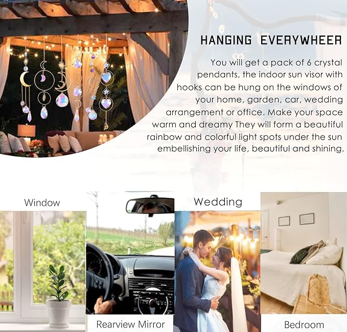 - 🌺Multiple Application: Hang these stunning rainbow sun catchers to your homes, offices, gardens, windows, or used for wedding display, car pendants, or Christmas trees, etc. Suitable for all kinds of occasions, sparking in the sun to create a dreamy atmosphere.