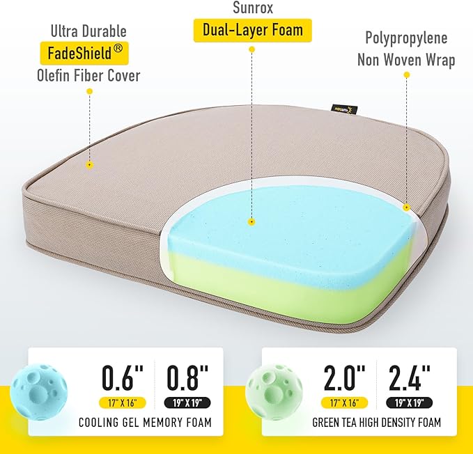 SUNROX Gel Memory Foam Chair Cushions, FadeShield Water-, Stain-Resistant Durable Reversible Seat Cushion Pads with Ties for Indoor/Outdoor Kitchen Dining Office, 19"x19", Set of 2, Husk Birch