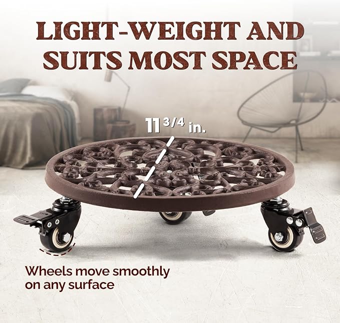IDZO Capacity 350 lbs Plant Caddy with Wheels Heavy Duty Cast Iron Plant Stand with Lockable Wheels 12 Inch Classis Style Dark Brown