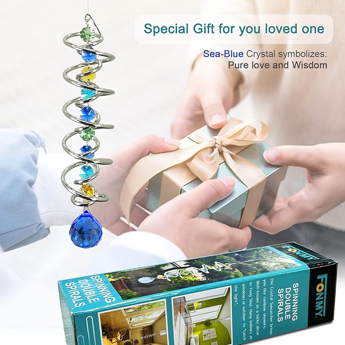 - 【HIGH QUALITY】:Made of stainless steel wire and crystal material, specail double structure spiral tail w/ solid blue color K9 crystal glass ball and raibow color chain crystals , promised good weather resistant and amazing decoration. All FONMY crystal ball made of top crystal glass material with finely crafted, high clarity and cast beautiful rainbows, could turn the sun's rays into many rainbows.