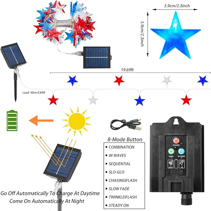 - 8 Lighting Modes with Memory Function: These Independence Day decorative string lights have 8 lighting modes for you to choose- combination, in waves, sequential, slogs, chasing/flash, slow fade, twinkle/flash, and steady on. Directly press the button on the solar panel to change the modes. Comes with memory function, after turning off the power, it will automatically remember the last setting, so it does not need to reset every day.