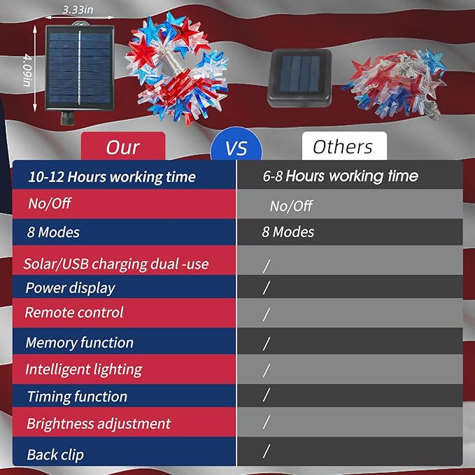 - New Upgraded Solar Patriotic Lights: Our upgraded solar panel added power indicate light, this light can display the percentage of power, each cell represents 25% of the power. New designed solar panel comes with a clip which allows the solar panel to be clamped to the fence and branches. When the sunlight is not sufficient, USB charging can be used, and when the sunlight is sufficient, directly solar powered, very convenient to use.