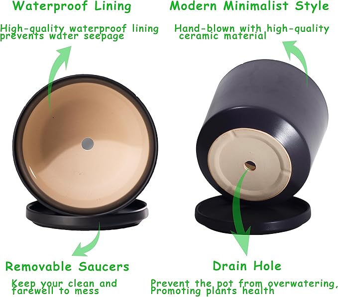 Ekirlin 9 inch Plant Pots,Ceramic Flower Planters Indoor,Modern Succulents Containers with Drain Hole Saucer,Decorate Home,Office & Outdoor (Black)