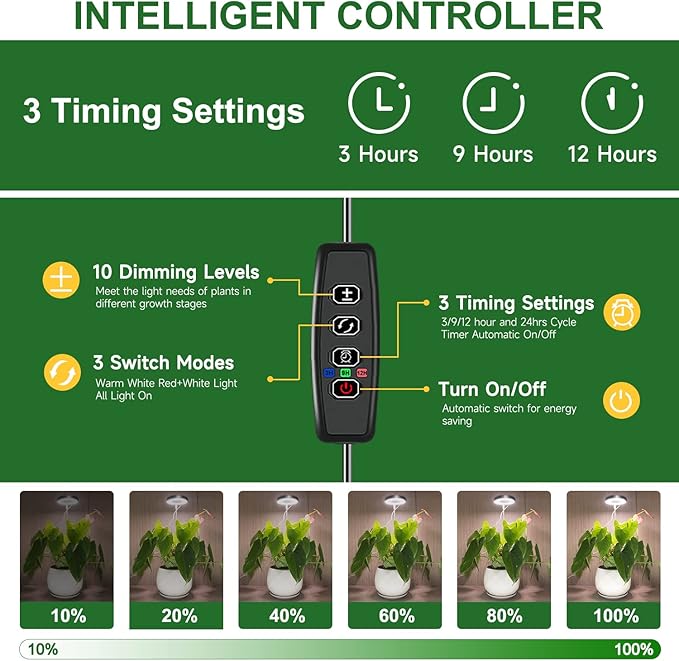 - 3 Lighting Modes and 10 Brightness: The full spectrum plant grow light offers 10 levels by pressing the button. 3 lighting spectrum “white light, warm white and red, Mix Lighting”. you have more options to meet different illumination requirements.