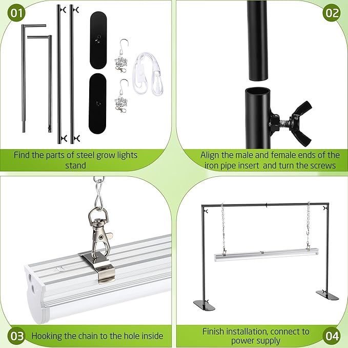 - 【Package Includes】1 x LED grow light, 1 x stand, 2 x chains, 1 x power cord, 1 x instructions (Warm Tips: the plant light stand is unassembled, you need to assemble it by yourself, please assemble it according to the pictures we provided)