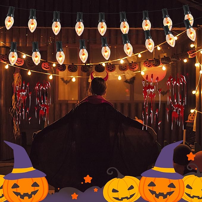 - UL Listed: Vintage Christmas Lights UL Listed for indoor and outdoor use. halloween decorations outdoor string lights is the perfect lighting decor, flicker flame string lights perfer for christmas halloween roofline backyard house garden patio wedding, create a spine-tingling atmosphere with flicker flame halloween string lights